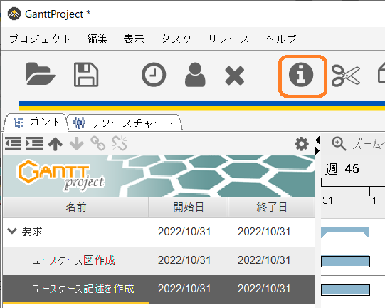 サブタスクにするには「ユースケース図作成」を選択したのち,タブキーを押してください.タブキーはインデントをつけるときによく用いられますので,このGanttProjectではインデントと同じようにサブタスクをとらえているということが分かります.なお,サブタスクをタスクへ格上げするには,シフトキーを押しながらタブキーを押します.これもインデントと同じ感覚ですね.