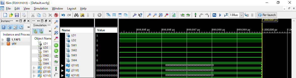 module t_FAFS; // Inputs reg SW1; reg SW2; reg SW3; reg SW4; // Outputs wire LD1; wire LD2; // Instantiate the Unit Under Test (UUT) FAFS uut ( .SW1(SW1), .SW2(SW2), .SW3(SW3), .SW4(SW4), .LD1(LD1), .LD2(LD2) ); integer i,j,k; initial begin // Initialize Inputs SW1 = 0; SW2 = 0; SW3 = 0; SW4 = 0; // Wait 100 ns for global reset to finish #100; // Add stimulus here for(i=0; i<2; i=i+1) begin for(j=0; j<2; j=j+1) begin for(k=0; k<2; k=k+1) begin #10 SW1 = SW1 + 1'b1; end SW2 = SW2 + 1'b1; end SW3 = SW3 + 1'b1; end end endmodule - ISimの起動