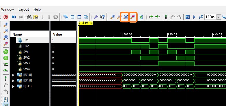 さて,これでは見たい100[ns]~200[ns]あたりが見えません.見たいところを中心に見るには下図に示すアイコンを使います.これらは画面上部にあります.