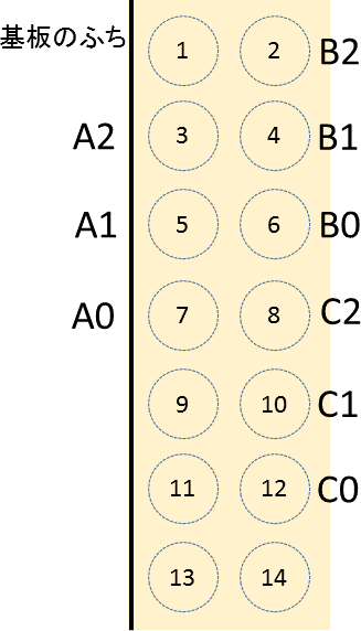 セレクタ回路において,入力信号は前述のとおり9ビットあり,A2,A1,A0(A),B2,B1,B0(B),C2,C1,C0(C)があります.これらがセレクタのJ1に割り付けられています.下の表はそのアサインを示しています.なお,空欄となっている端子に何が接続されているか(もしくは接続されていないか)をテスタで確認してください.